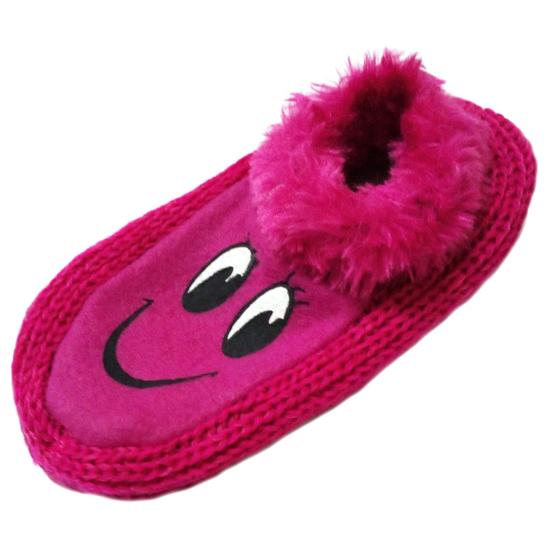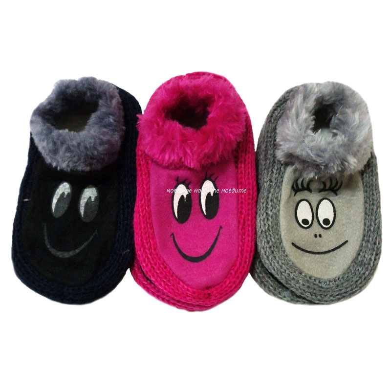 Тапочки детские вязаные, с опушкой, сверху украшены рисунком в виде "глазок". На подошве антискользящее покрытие. В упаковке по 4 пары на размер. Размер указан по длине подошвы в сантиметрах.